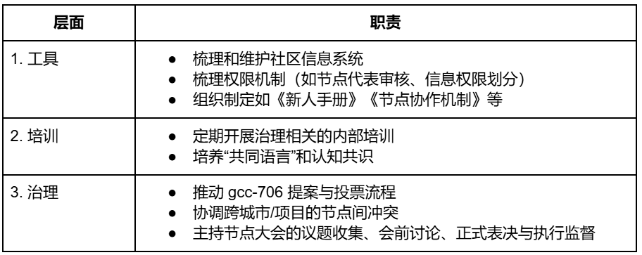 - 一个支持性的组织,支持节点大会和节点群的正常运作