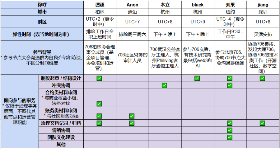 共识:对共同治理本质理解,非个人控制型合作模式,自发动机与愿景共鸣度高度契合。总体上对706组织去中心化、高度自治、法治取代人治的愿景一致。愿意投入时间和精力在706身上,对组织有着责任心和使命感。