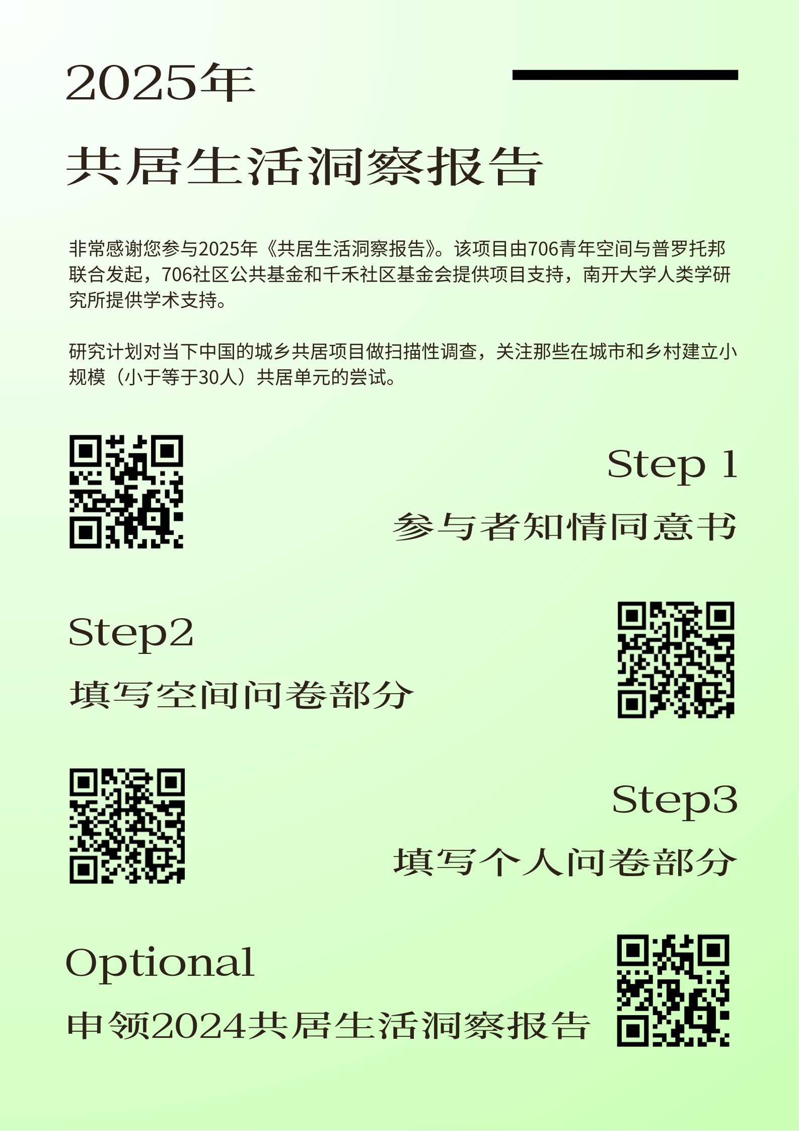 我们将在去年报告的基础上,完成2025年共居生活洞察报告的调研、撰写、设计、印刷和发布全流程的工作。